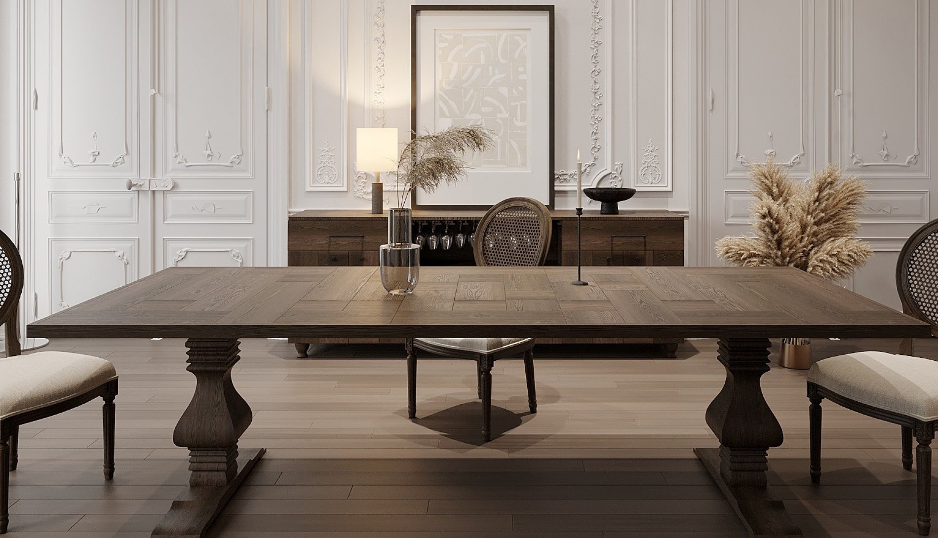 Pedazo yemek masası, modern tasarımın sıcak ahşap tonlarıyla buluşmasını temsil ediyor. Usta ellerde yapılan fırçalama işlemi, derin eskitme yüzeyi meydana çıkarıyor.